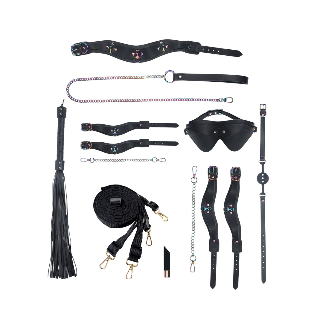 El kit de la col·lecció Venice d'Ouch! ve en una bossa de mà preciosa. Amb un aspecte iridescent de gamma alta al seu maquinari, i inclou un collar i una corretja. Un joc de manilles. I joc de punys de turmell. Una bena als ulls. Un mordaç de pilota transpirable. Un aixafador. Un sistema de retenció sota el matalàs i una bala vibradora recarregable. El kit perfecte per satisfer fins i tot els amants del bondage més avançats. Totes les joguines Shots tenen una garantia d'1 any.