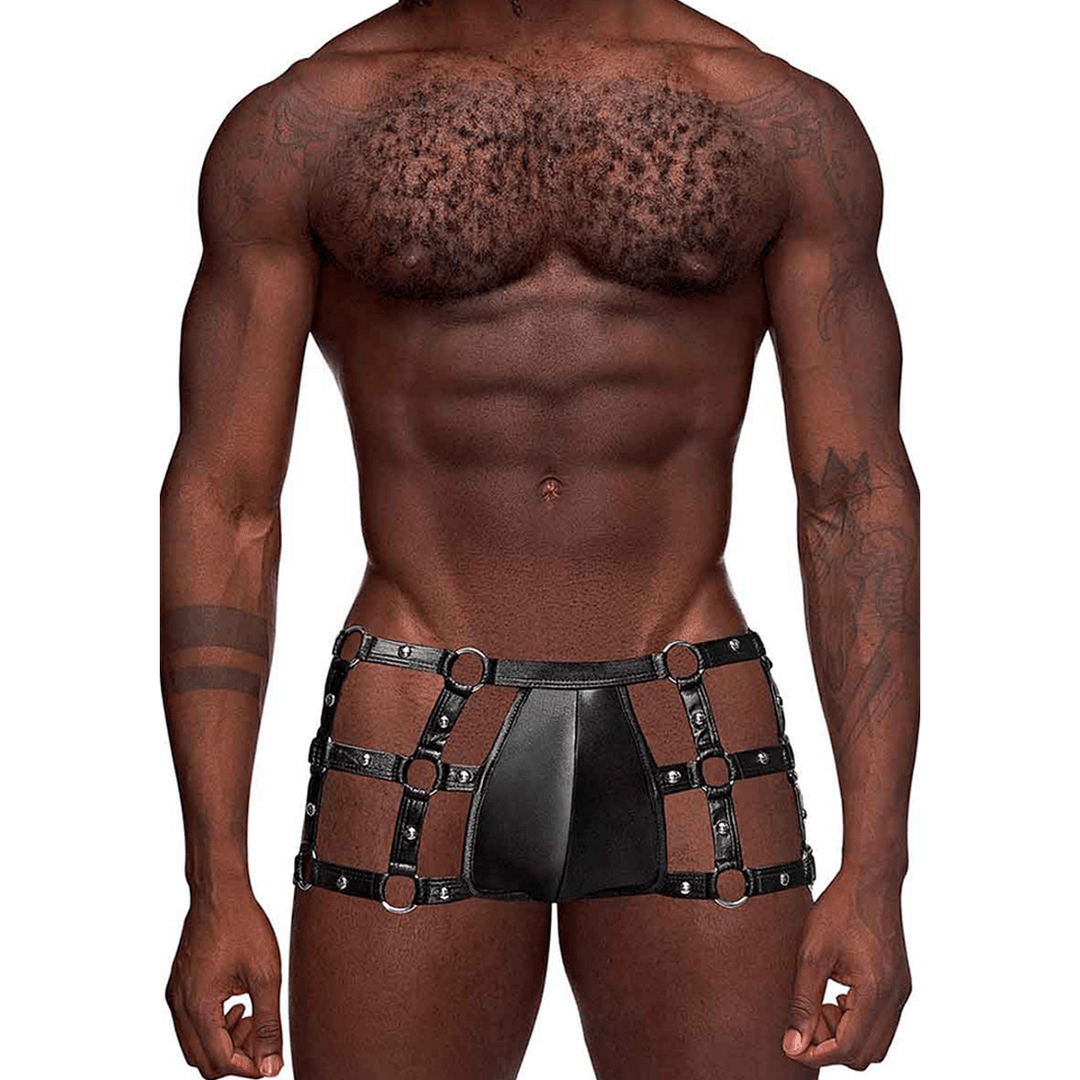 De la col·lecció Fetish de Male Power, aquest estil inclou: Un curt de gàbia retallada amb corretges de tela amb tacs amb anells metàl·lics.
